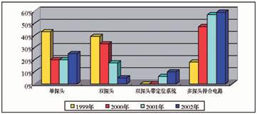 圖1 所示從1999年到2002年(2002年的數(shù)據(jù)是由上半年數(shù)據(jù)推算而來)單探頭、雙探頭、雙探頭帶定位系統(tǒng)和多探頭符合線路,四種不同核醫(yī)學(xué)設(shè)備每年各種類型所占比例?梢钥闯。最為明顯的是普通雙探頭在2002年僅僅占總數(shù)的5%,普通單探頭占總數(shù)25%,多探頭帶符合電路系統(tǒng)占總數(shù)59%。普通雙探頭帶X線定位系統(tǒng)占總數(shù)10%。可以看出單探頭SPECT和多探頭符合電路系統(tǒng)呈增長趨勢,尤其以多探頭符合電路系統(tǒng)更為明顯。